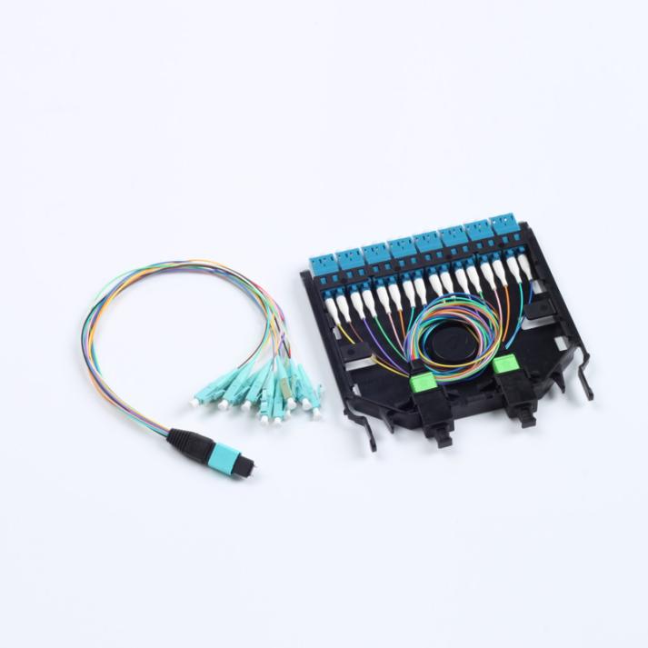 The LC adaptor panel in the front of the module box is used for connecting the equipment or between the module box, and MPO adapter at rear is used for connecting MPO pre-connected trunk cables.