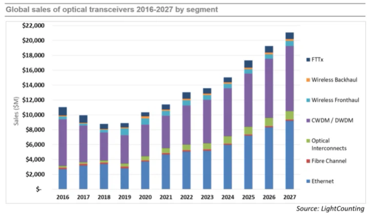 Our latest forecast projects a 11% CAGR in 2022-2027, not very different from the 13% CAGR in the forecast published in October 2021. Strong sales of DWDM and Ethernet optics accounted for most of the market growth in 2021 and these segments are projected to lead the growth in 2022-2027. Sales of optical interconnects, mostly Active Optical Cables (AOCs), will also increase at double digit rates over the next 5 years. PON sales for FTTx networks will remain steady, as the China market ends its 10G cycle and North America and Europe ramp up 10G PON deployments, driven by government funding programs. 25G and 50G PON provide new growth later in the forecast period. Wireless fronthaul is one area of weakness, since 5G network deployments in China are reaching completion. This segment will return to growth in 2026-2027 with the onset of 6G deployments.