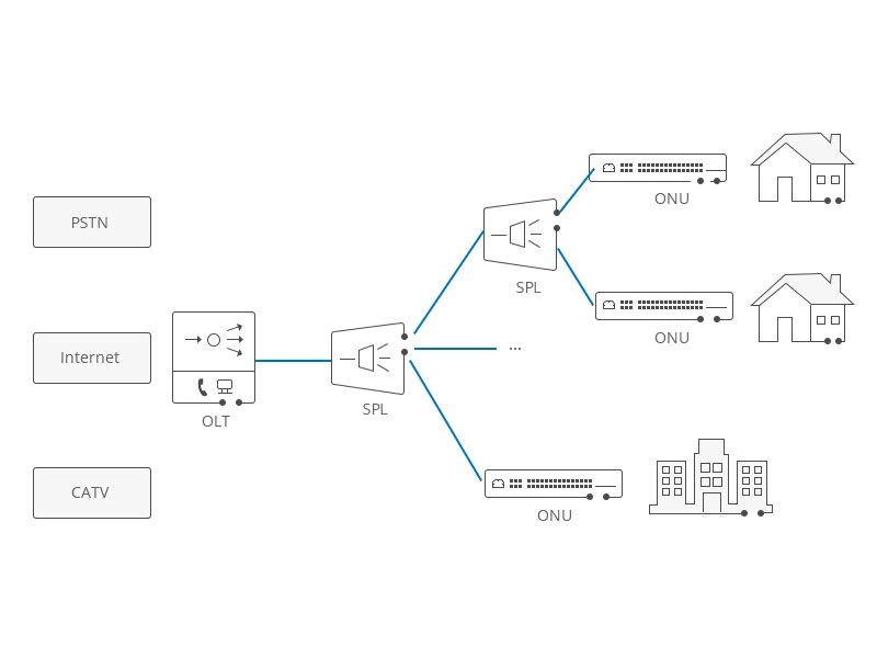 A passive optical network refers to a fiber-optic network utilizing a point-to-multipoint topology and optical splitters to deliver data from a single transmission point to multiple user endpoints. In contrast to AON, multiple customers are connected to a single transceiver by means of a branching tree of fibers and passive splitter/combiner units, operating entirely in the optical domain and without power in a PON architecture. There are two major current PON standards: Gigabit Passive Optical Network (GPON) and Ethernet Passive Optical Network (EPON). Their topology structures are basically the same. As the first choice in many FTTH deployment scenarios, the PON solution has several prominent benefits:
